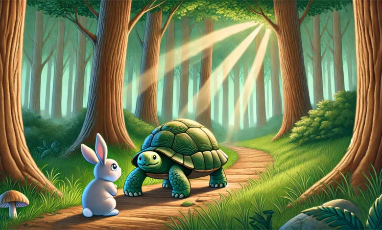 Bir vakitler, geniş ve yeşil bir ormanda Akıllı Tavşan ve Yavaş Kaplumbağa isminde iki arkadaş yaşarmış. Akıllı Tavşan, çok süratli koşar ve her vakit en güzel fikirleri o bulurmuş. Herkes onun zekasına hayran kalır, lakin Kaplumbağa, tavşanın süratliliğine ve zekasına karşın, sakin ve sabırlı biriymiş. Kaplumbağa, tavşanla çok düzgün arkadaş olmasına karşın, her vakit kendi suratında ilerler, her işin aceleye gelmemesi gerektiğini söylerdi.