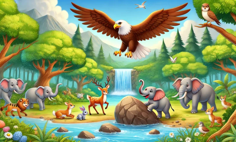 Kartal geri dönüp Tera’ya haber verdi: “Kayayı kaldırmak için sırf benim gücüm yetmez. Ormanın tüm hayvanlarının yardımı gerekiyor.” Tera, süratle ormana döndü ve tüm hayvanlara haber verdi. Filler, geyikler, kuşlar ve daha kaçları kayanın olduğu yere toplandı. Daima birlikte çalışarak büyük kayayı kaldırdılar ve suyun tekrar akmasını sağladılar.