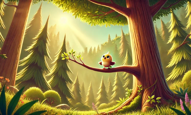 Bir sabah, Pırıltı büyük ağacın altındaki çimenlere uçtu ve büyük ağacın yaşlı gövdesine tünedi. “Ben de büyüyüp güçlenecek miyim, büyük ağaç?” diye sordu. Ağaç, yavaşça rüzgarın sesiyle yanıt verdi: “Büyümek vakit alır, minik kuşum. Lakin sabırla ve sevgiyle büyürsen, sen de çok güçlü olacaksın.”