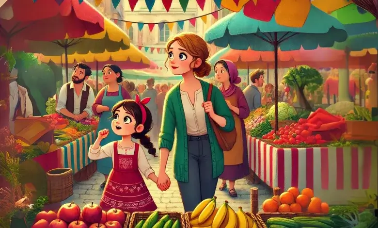 Pazar yerine vardıklarında, tezgâhların arasında rengârenk sebzeler ve meyveler sergileniyormuş. Satıcılar, neşeli seslerle müşterilerini çağırırken, Ela etrafına hayranlıkla bakmış. En sevdiği kırmızı elmalar, mor patlıcanlar ve sarı muzlar göz alıcı bir şekilde diziliymiş. Annesi, Ela’ya dönerek, “Hadi bakalım, önce hangisini seçelim?” diye sormuş.